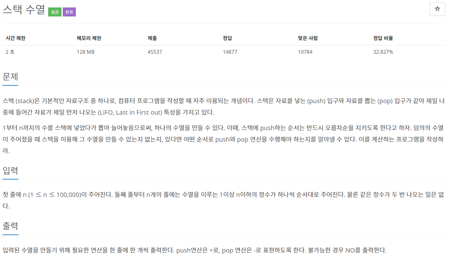 from collections import deque n = int(input()) nums = deque([int(input()) for _ in range(n)]) # 주어진 수열을 큐 형태로 사용 stack = [] result = [] # 스택에 1 ~ n까지의 수를 오름차순으로 삽입 for i in range(1, n + 1): stack.append(i) result.append('+') # nums와 stack에 원소가 있고, nums의 첫번째 값이 stack의 최상단 값과 같다면 while nums and stack and nums[0] == stack[-1]: stack.pop() # 스택의 최상단 값 제거 nums.popleft() # 큐의 맨 앞에 있는 값 제거 result.append('-') # nums에 원소가 남아 있다면 'NO'를 출력 if nums: print("NO") # nums가 비어있다면 result의 연산자들을 모두 출력 else: for i in result: print(i)'Coding Test > 백준' 카테고리의 다른 글