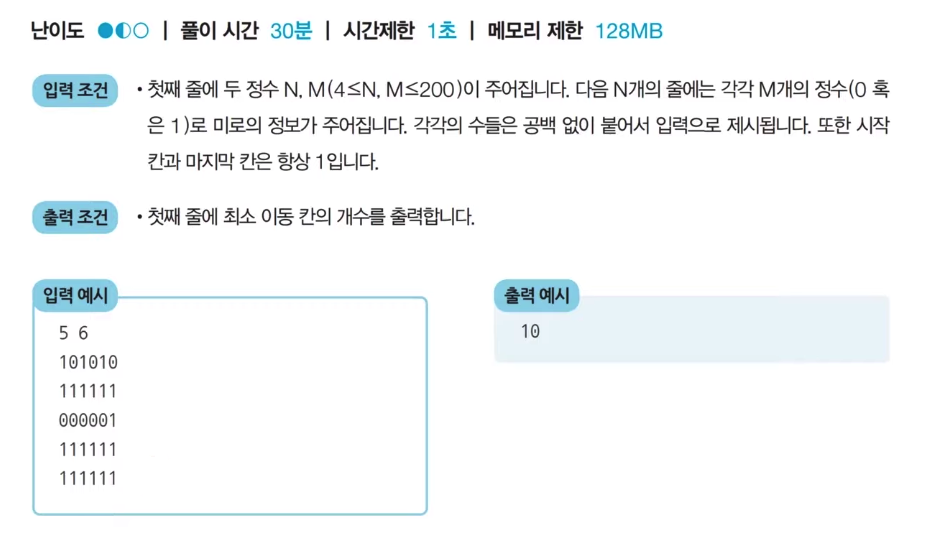 동빈이는 N × M 크기의 직사각형 형태의 미로에 갇혀 있다. 미로에는 여러 마리의 괴물이 있어 이를 피해 탈출해야 한다. 동빈이의 위치는 (1, 1)이며 미로의 출구는 (N, M)의 위치에 존재하며 한 번에 한 칸씩 이동할 수 있다. 이때 괴물이 있는 부분은 0으로, 괴물이 없는 부분은 1로 표시되어 있다. 미로는 반드시 탈출할 수 있는형태로 제시된다. 이때 동빈이가 탈출하기 위해 움직여야 하는 최소 칸의 개수를 구하시오. 칸을 셀 때는 시작 칸과 마지막 칸을 모두 포함해서 계산한다