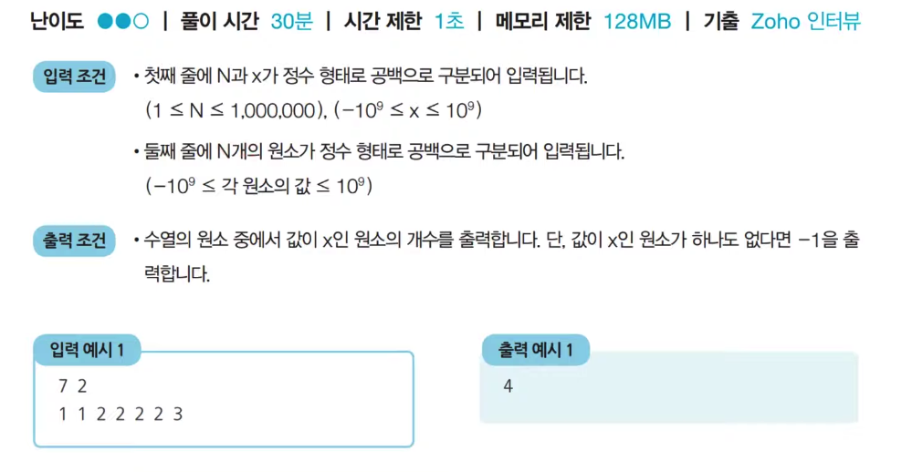 N개의 원소를 포함하고 있는 수열이 오름차순으로 정렬되어 있습니다. 이때 이 수열에서 x가 등장하는 횟수를 계산하세요. 예를 들어 수열 {1, 1, 2, 2, 2, 2, 3}이 있을 때 x = 2라면, 현재 수열에서 값이 2인 원소가 4개이므로 4를 출력합니다.