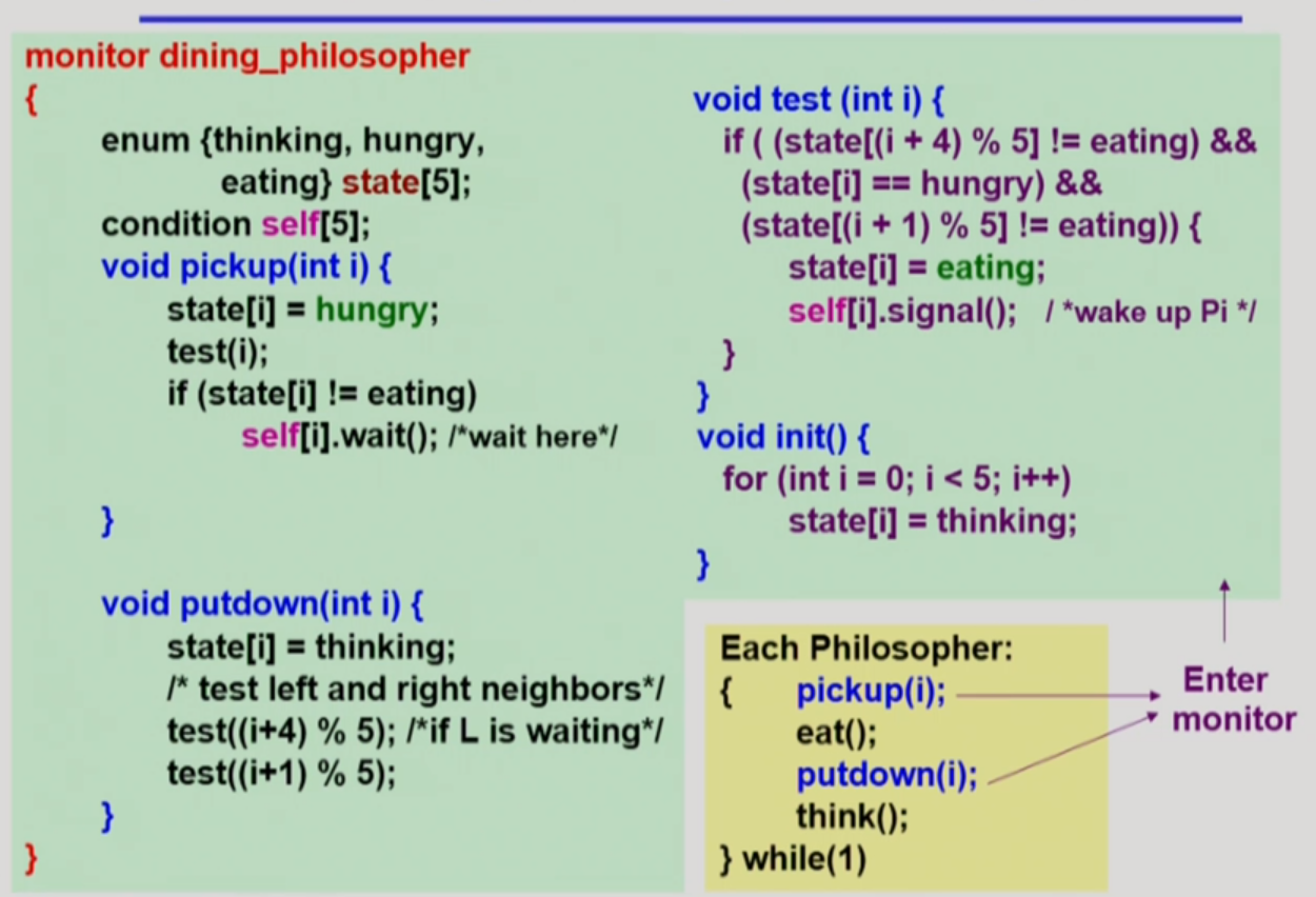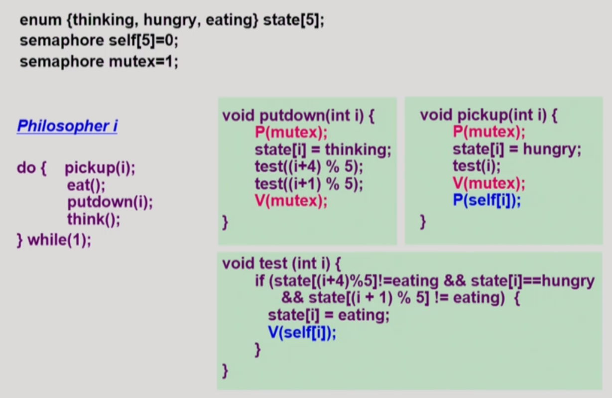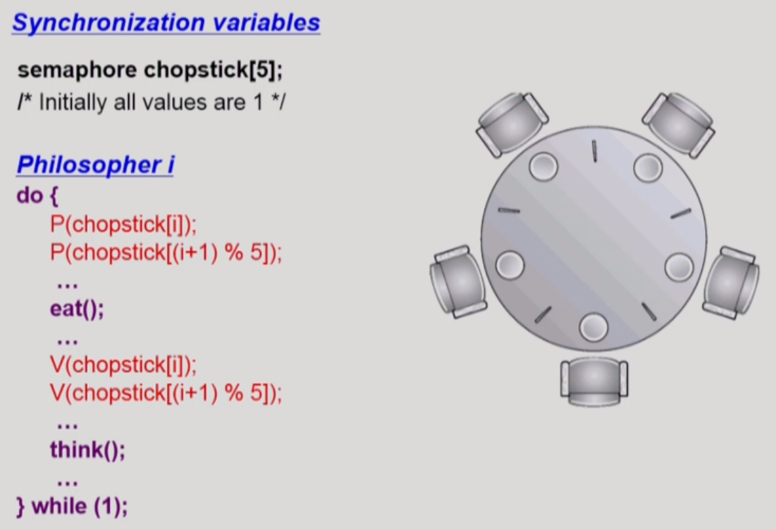 이러한 문제는 위와 같은 수도 코드로 나타낼 수 있다. Semaphore 배열 chopstick은 5개의 젓가락에 대한 사용 여부를 0과 1값으로 표현한다. 그리고 chopstick[i]는 자신의 왼쪽 젓가락, chopstick[i + 1]은 자신의 오른쪽 젓가락을 나타낸다. 만일 자신의 오른쪽이나 왼쪽에 있는 철학자가 음식을 먹고 있다면, 그 차례가 끝나고 자신이 양쪽 젓가락을 모두 확보할 수 있을 때에서야 비로소 음식을 먹을 수 있다.