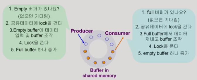 이러한 상황에서 두 가지 문제가 발생할 수 있다. 첫째로, 하나의 버퍼에 둘 이상의 프로세스가 접근했을 때 발생하는 문제이다. 이는 생산자와 소비자 각각의 측면에서 살펴볼 수 있는데, 생산자 측면에서는 하나의 비어있는 버퍼에 두 가지 이상의 생산자 프로세스가 접근해 조작을 시도하면 synchronization 문제가 발생한다. 소비자 측면에서도 데이터가 존재하는 버퍼에 둘 이상의 소비자 프로세스가 접근하면 마찬가지로 synchronization 문제가 발생한다. 이 문제들을 해결하기 위해서는 앞에서 살펴봤듯이 하나의 프로세스가 버퍼를 조작할 때 lock을 걸고, 작업을 완료할 때 lock을 푸는 과정이 필요하다.