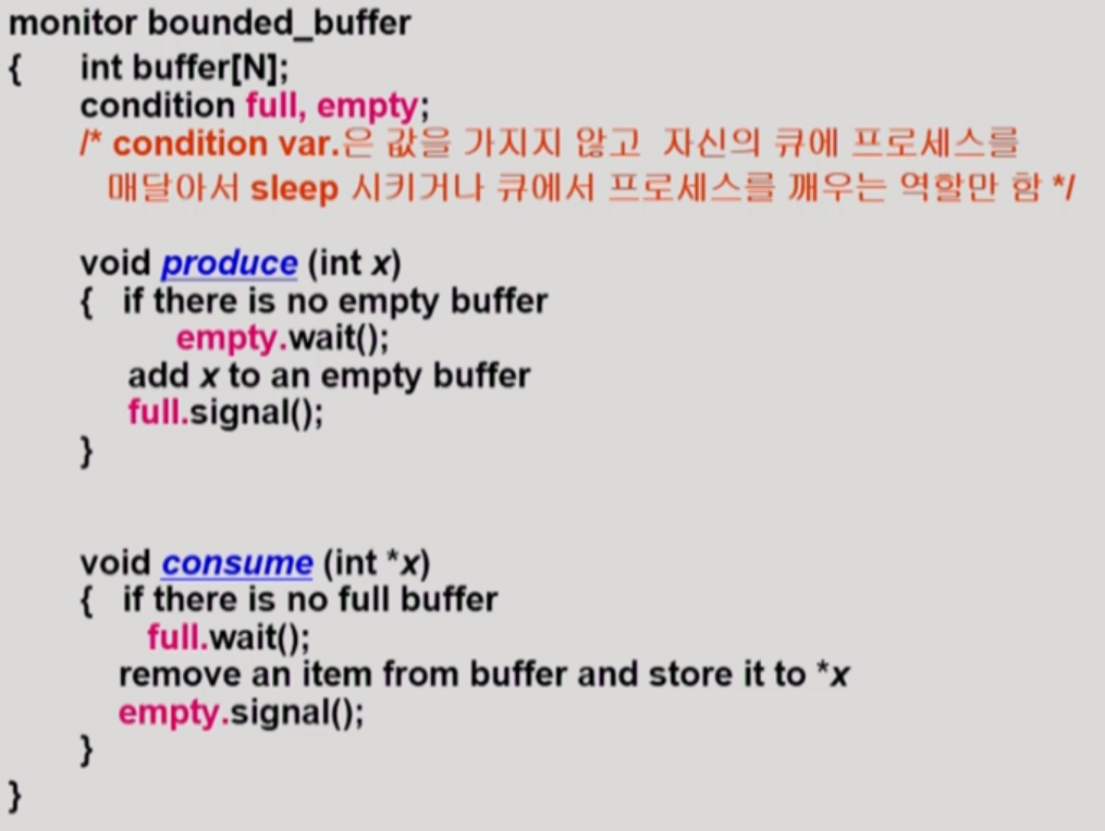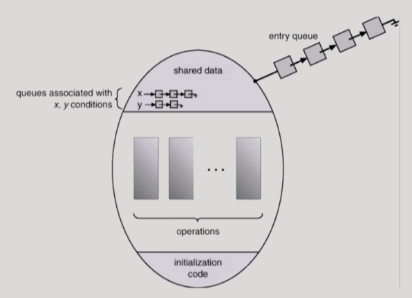 Monitor에는 어떤 조건에 따라 프로세스의 상태를 통제하는 condition variable(위 그림의 x, y)과 프로세스를 condition variable에 줄세우고 잠들게 하는 wait() 연산, condition variable에 잠자고 있는 프로세스를 깨우는 signal() 연산이 존재한다. 예를 들어, x.wait()은 프로세스를 x라는 condition variable에 줄세우고 잠들게하는 작업을 수행하고, x.signal()은 x에 잠들어 있는 프로세스 하나를 깨워주는 작업을 한다. 즉, wait() 연산이 적용된 프로세스는 다른 프로세스가 signal() 연산을 사용하기 전까지 suspend 상태가 된다. 반면에, signal() 연산은 suspend된 프로세스 하나를 다시 동작하게 하는 일을 한다.