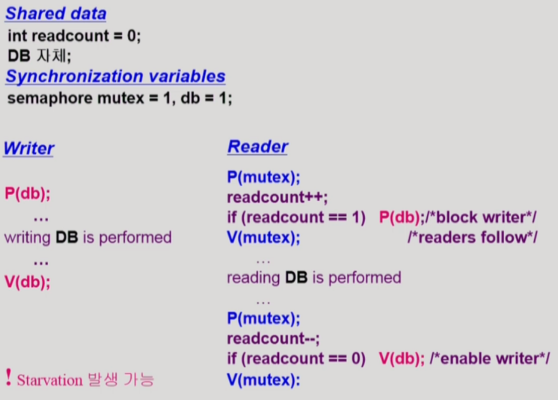이러한 구현에서 한 가지 유의할 점은 계속 Reader 프로세스가 들어오면 Writer 프로세스에게는 DB에 접근할 기회가 돌아오지 않는 Starvation 문제가 발생할 수 있다는 것이다.