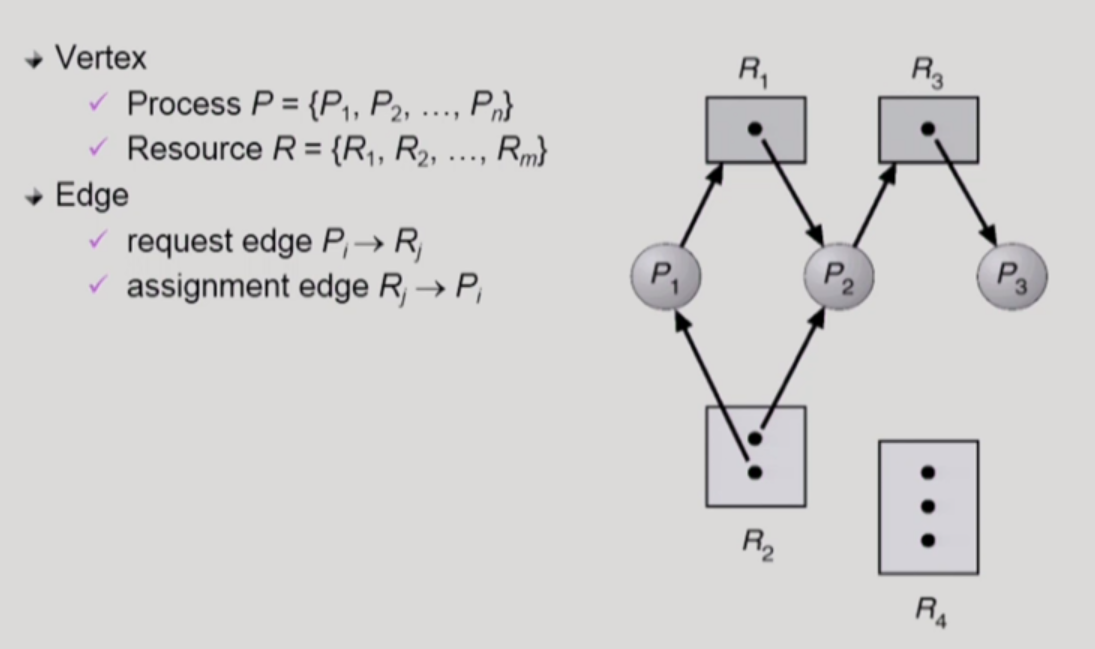 Deadlock의 발생 여부를 판단하기 위해 Resource-Allocation Graph(자원할당그래프)를 사용한다. 위 그래프는 자원할당그래프의 예시이고 동그라미는 프로세스, 네모는 자원을 나타낸다. 네모 안의 검은 점은 자원의 instance, 즉 자원의 개수를 표현한다.
