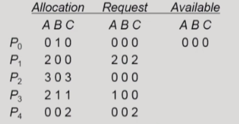 또한, 자원의 instance가 여러 개인 경우에도 앞선 Deadlock Avoidance와 비슷하게 처리한다. 위와 같은 상황은 가용 가능한 자원이 없어 deadlock에 처한 것처럼 보이지만, Allocation에서 P0가 Request하는 자원이 따로 없기 때문에, 할당된 자원이 반납될 것으로 예상된다. 이를 고려하여 차근차근 프로세스들의 Request들을 처리해나가면 deadlock 상황이 아닌 것으로 판단된다.