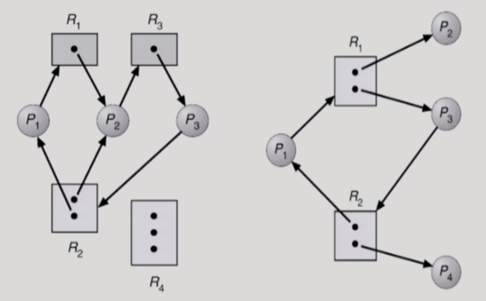 위의 왼쪽 그래프와 오른쪽 그래프는 cycle이 존재해도 instance가 여럿 있는 자원이 있기 때문에 deadlock을 단정지을 수는 없다. 왼쪽 그래프의 경우, 직접 화살표를 따져보면 서로 자원을 양보하지 못하는 상황이어서 deadlock이 발생했음을 확인할 수 있다. 반면, 오른쪽 그래프는 P2와 P4가 자원을 반납하면 얼마든지 cycle이 소멸할 수 있기 때문에 deadlock 상황이 아니라고 판단된다.