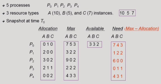 만일 자원의 instance가 여러 개일 경우라면, 위 그림처럼 Banker's Algorithm을 사용한다. 위 그림에서는 프로세스가 미래의 사용할 자원의 총량을 미리 예측하여 Max라는 테이블로 표시했다. Allocation은 현재 프로세스들이 자원을 확보하고 있는 상태를 나타내고, Need는 Max에서 Allocation을 뺀 값들을 기록한 것으로서 앞으로 프로세스가 얼마만큼의 자원을 더 요청할 것인지 계산한다. 그리고 남아있는 자원을 표시한 Available과 미리 계산한 각 프로세스들의 Need를 비교해 각 프로세스들의 deadlock 가능성을 예측하고, deadlock 가능성이 없는 프로세스에게 자원을 할당한다. 예를 들어, P1의 경우 Available 내에서 미래의 자원(Need)을 공급할 수 있기 때문에 deadlock 가능성이 적은 것으로 판단하여 자원 획득을 허용해준다. 반면, P0는 Available 허용 범위를 벗어나는 자원 수(Need)들을 앞으로 요청할 예정이므로 deadlock 가능성이 높다고 판단하여 자원을 내어주지 않는다. 그리고 만일, 다른 프로세스의 작업이 끝나서 자원이 반납되어 가용 자원의 수가 늘었다면, 자원의 수가 허락되는 선에서 이전에 자원을 받지 못했던 프로세스에게 자원을 내어준다.