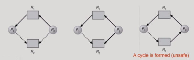 Deadlock Avoidance 방법은 만일 자원의 instance가 한 개일 경우, Resource-Allocation Graph(자원할당그래프)를 사용하여 deadlock을 피한다. 위 그림은 자원의 instance가 하나일 경우인데, 점선은 프로세스가 화살표가 가리키는 방향의 자원을 미래에 획득할 가능성을 표시한다. 여기서 P2 프로세스는 R2 자원을 미래에 획득할 가능성이 있기 때문에, 가운데 그림처럼 P2가 R2 자원을 요청할 수 있지만, deadlock의 가능성이 있기 때문에 실제로 자원을 내어주지는 않는다.