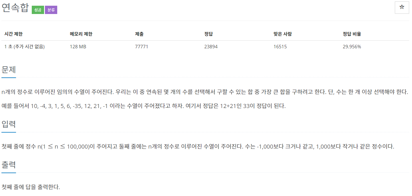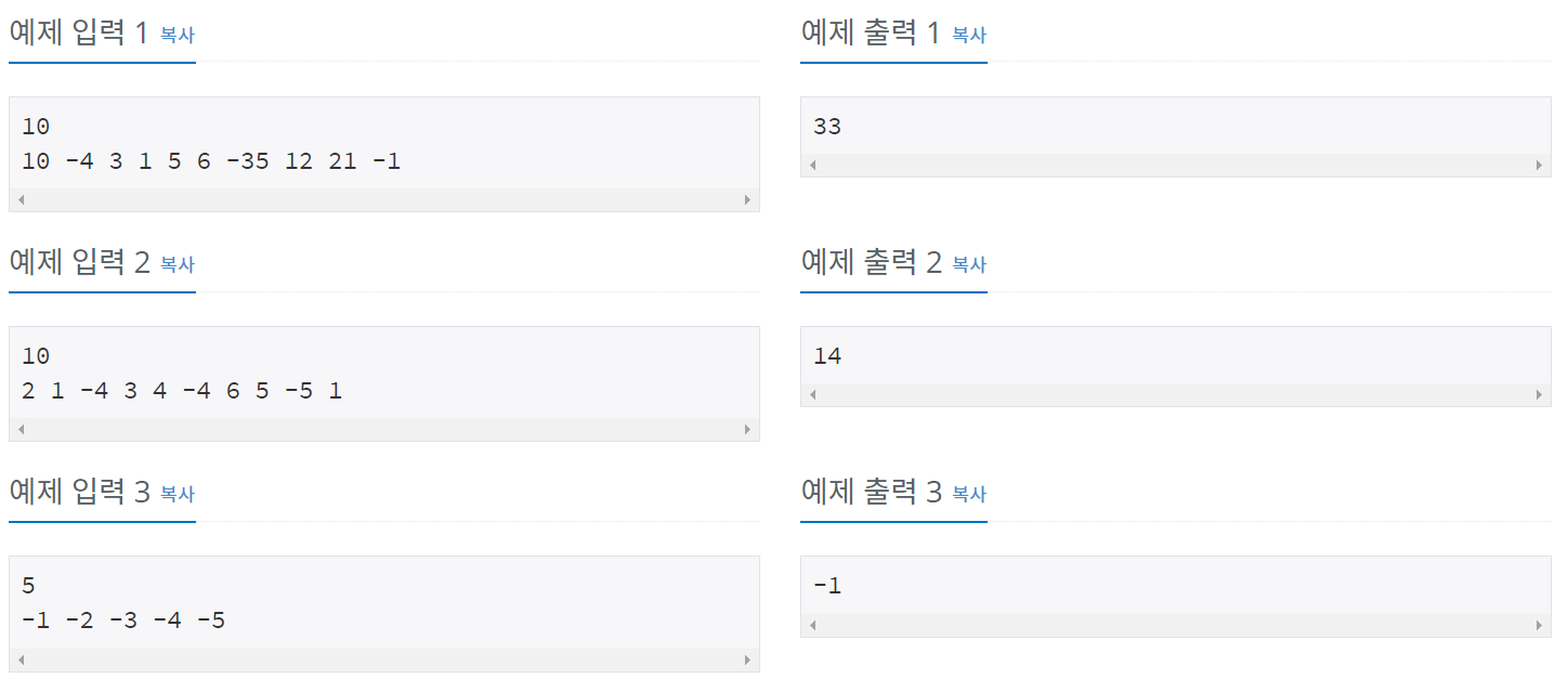 n = int(input()) nums = [-1001] # 인덱스를 맞추기 위해 가장 작은 수를 하나 삽입 nums = nums + list(map(int, input().split())) # 점화식을 기록하는 테이블을 만들고 초기화 n_sum = [-1001] * 100001 n_sum[1] = nums[1] # 왼쪽부터 차례로 합을 더해나가면서 새로운 수와 비교 for i in range(2, n + 1): n_sum[i] = max(n_sum[i - 1] + nums[i], nums[i]) # 결과 출력 print(max(n_sum))생각해볼 점