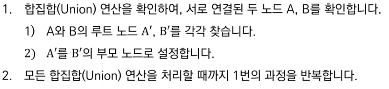 서로소 집합 자료구조(Union Find 자료구조)는 서로소 부분 집합들로 나누어진 원소들의 데이터를 처리하기 위한 자료구조이다. 서로소 집합 자료구조에는 두 가지 연산이 존재하는데, 두 개의 원소가 포함된 집합을 하나의 집합으로 합치는 합집합(Union) 연산과 특정한 원소가 속한 집합이 어떤 집합인지 알려주는 찾기(Find) 연산이 그것이다.