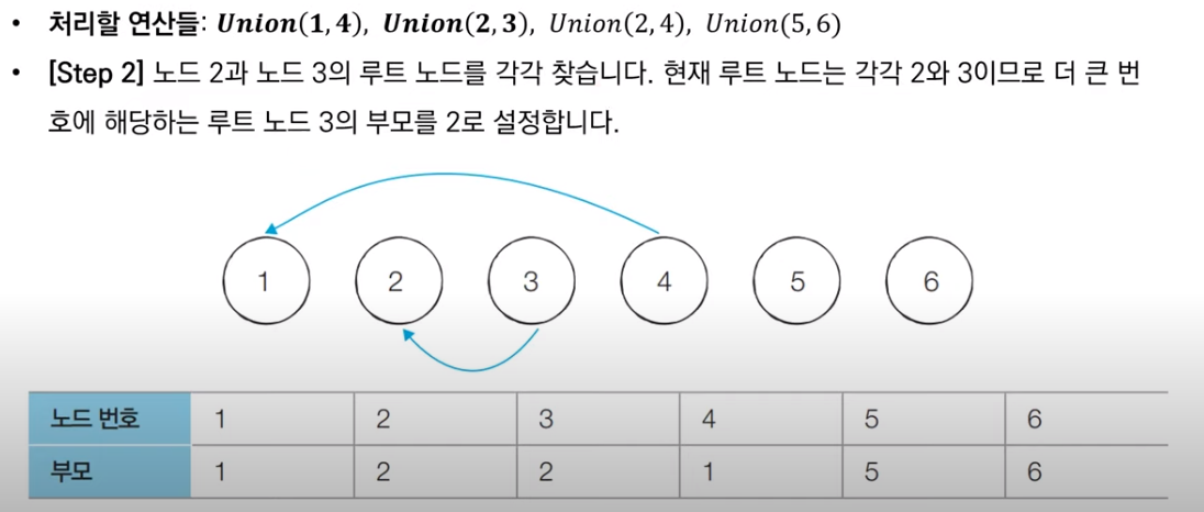 Union(1, 4) 연산이 끝나면, Union(2, 3) 연산을 진행한다. 노드 2와 노드 3에 대하여 루트 노드를 찾는데, 이번에도 자기자신이 루트 노드이고 3이 더 큰 번호 노드이므로 3번 노드의 부모 노드를 2번 노드로 설정한다.