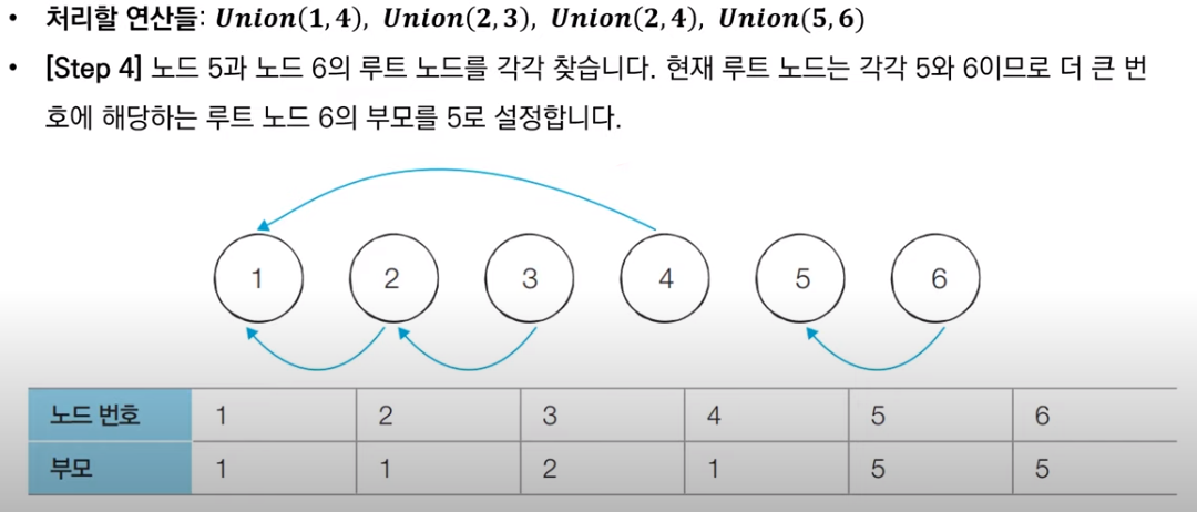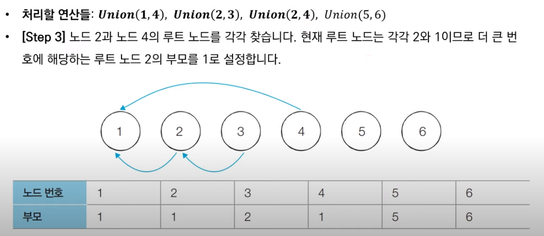테이블 생성 및 초기화가 끝나면, 첫 번째로 Union(1, 4) 연산을 처리한다. 이를 처리하기 위해 Union 연산의 인자 값으로 주어진 노드 1과 노드 4의 루트 노드를 찾는다. 여기서는 각자 자기자신이 루트 노드에 해당하므로, 1과 4 중 더 큰 번호에 해당하는 노드 4의 부모노드를 1번 노드로 설정한다. 일반적으로, 큰 번호 노드를 작은 번호 노드의 자식 노드로 설정하는 것이 관행이 있어서 이 규칙을 따라 예시를 진행하겠다.