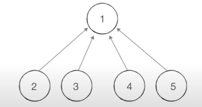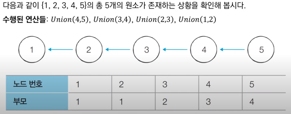 위는 최악의 경우를 가정한 예시다. 위와 같이 Union 연산이 편향적으로 수행되면, 5번 노드에 대해서 찾기(Find) 함수를 수행할 시 모든 노드를 다 확인하여 1번 노드를 루트 노드로 반환하는 비효율적인 동작을 보인다. 이 때, 시간 복잡도는 O(V)다.