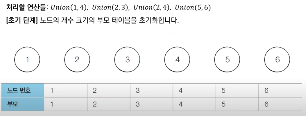 위와 같이 4개의 Union 연산이 주어졌을 상황을 가정해보자. 먼저 노드 개수만큼의 크기를 가지는 부모 노드를 표현하는 테이블을 생성하고, 테이블 내 각 노드의 부모노드를 자기자신으로 초기화한다.