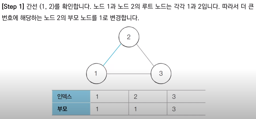 그 다음, 1번 노드와 2번 노드를 연결하는 간선을 확인하여, 어떤 노드가 부모노드가 될 지 판단한다. 1번과 2번 노드의 부모 노드는 각자 자기자신이므로, 더 큰 번호에 해당하는 2번 노드의 부모 노드를 1번 노드로 설정한다.