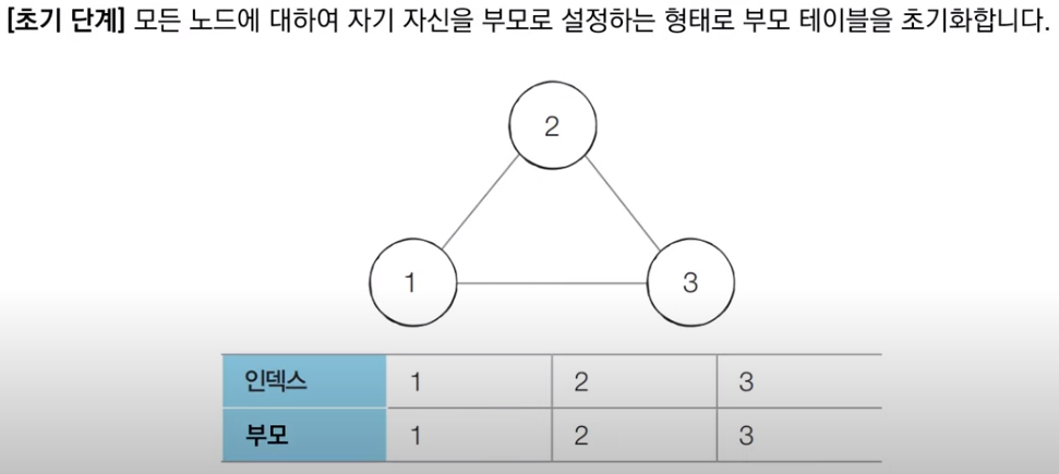 처음에는 기존 서로소 집합 자료구조 구현과 같은 초기화 과정을 거친다. 각 노드에 대하여 부모 노드를 자기자신으로 설정한다.