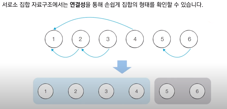 이와 같은 서로소 집합 자료구조는 각 집합들간의 연결성을 통해 총 몇 개의 집합이 존재하는지를 손쉽게 확인할 수 있다는 장점이 있다. 위의 1, 2, 3, 4번 노드들은 하나의 루트 노드를 가지며 트리 구조 형태를 띈다. 이런 경우 1, 2, 3, 4번 노드들은 원소가 4개인 하나의 집합으로 파악할 수 있다. 또한 5, 6번 노드도 원소가 2개인 또 다른 집합으로서 존재한다. 결론적으로, 위 그래프에서는 총 2개의 집합(1, 2, 3, 4번 노드 집합과 5, 6번 노드 집합)이 존재하고, 그 2개의 집합은 서로소 관계를 가진다.