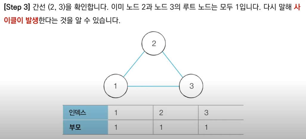 끝으로 2번 노드와 3번 노드 사이의 간선을 확인한다. 2번 노드와 3번 노드 각각의 루트 노드는 1번 노드이므로, 이미 같은 집합에 속해 있음을 알고 사이클이 발생함을 파악할 수 있다.