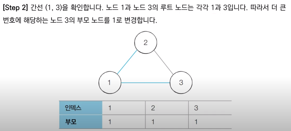 다음은 1번 노드와 3번 노드를 잇는 간선을 확인한다. 1번 노드와 3번 노드도 각각의 부모 노드가 자기 자신이므로, 더 큰 번호에 해당하는 3번 노드의 부모 노드를 1번 노드로 설정한다.