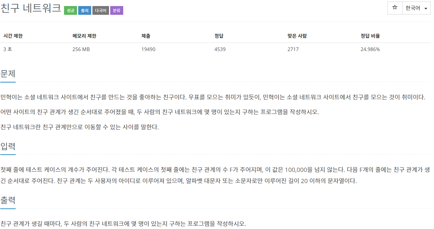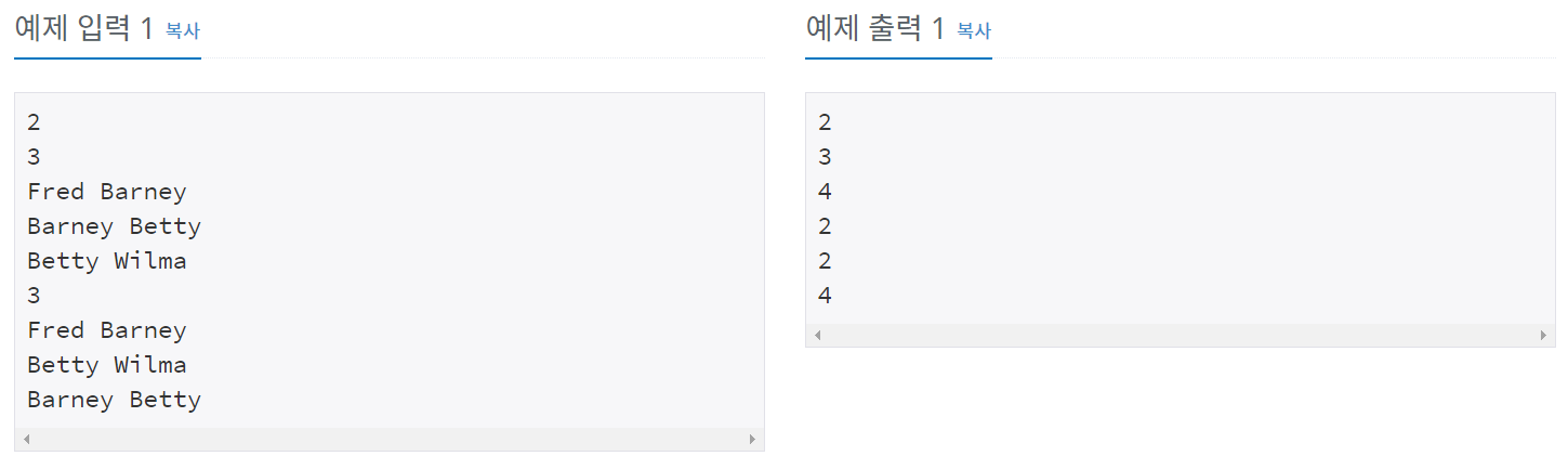 시간초과, 출력초과에 계속 걸려 시간을 많이 보냈는데, 개수를 세는 테이블을 따로 생성하고 같은 집합일 경우에는 합치기 연산을 중복으로 수행하지 않도록 예외처리하니 잘 풀렸다.