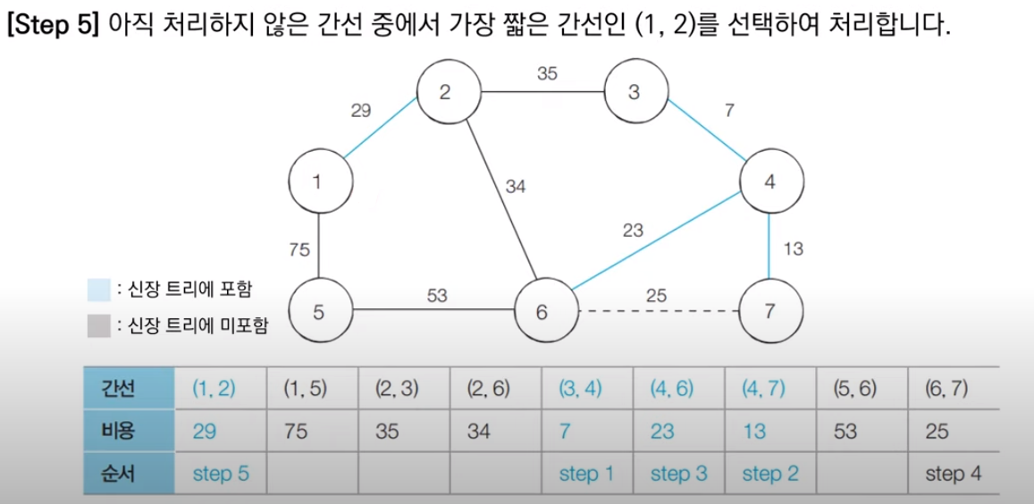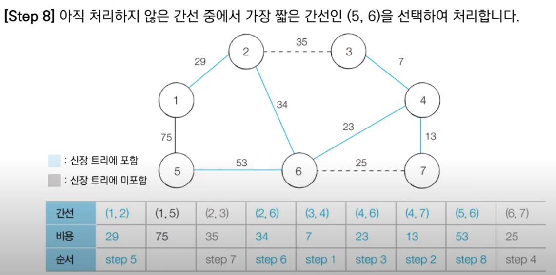 다음 최소 비용에 해당하는 5번과 6번 노드를 잇는 간선은 두 노드가 서로 다른 집합에 속하므로, Union 함수를 호출하여 최소 신장트리에 포함시킨다.