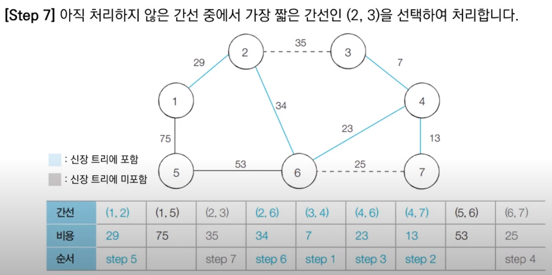 다음 최소 비용에 해당하는 2번 노드와 3번 노드를 연결하는 간선은 두 노드가 같은 집합에 속하므로 무시한다.