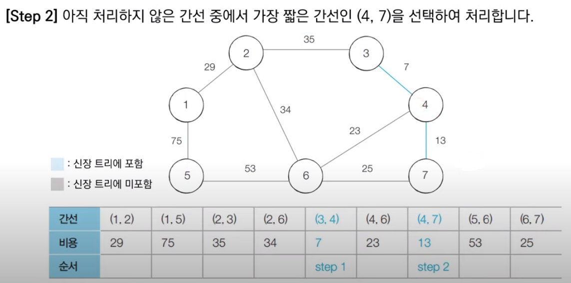 다음으로 다음 최소 비용에 해당하는 4, 7번 노드를 잇는 간선을 확인한다. 두 노드 역시 다른 집합에 속해 사이클을 생성하지 않으므로, Union 함수로 최소 신장 트리에 포함한다.