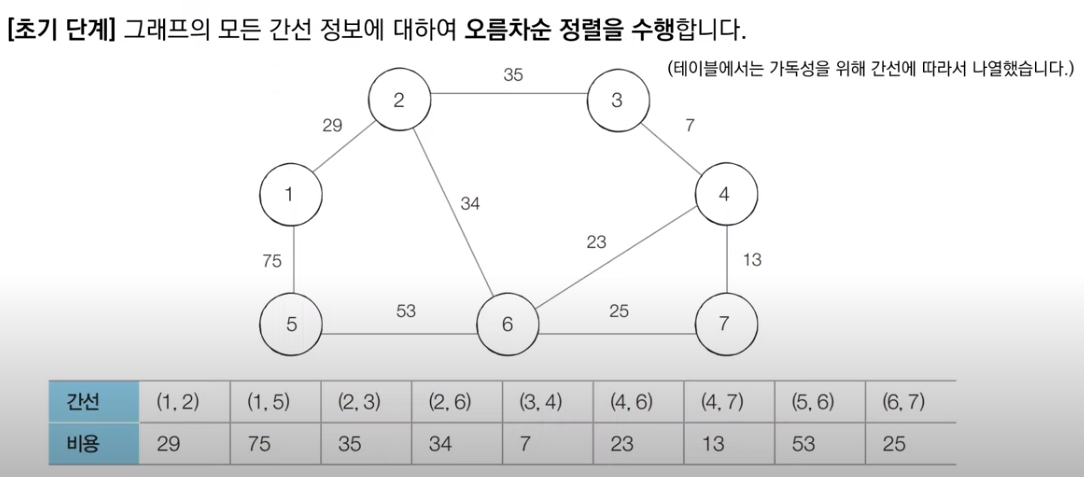 위와 같이 원본 그래프가 주어졌을 때, 먼저 간선을 오름차순으로 정렬하고 작업을 수행한다. 위 그림의 테이블은 가독성을 위주로 간선 정보가 나열되어 있기 때문에 혼돈하지 않도록 하자.