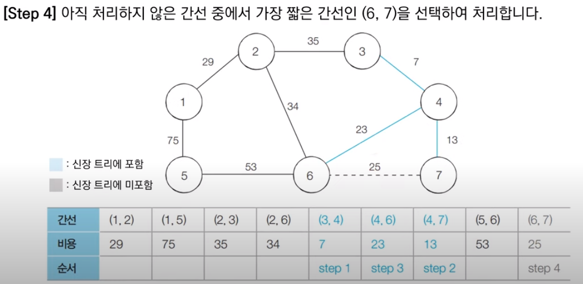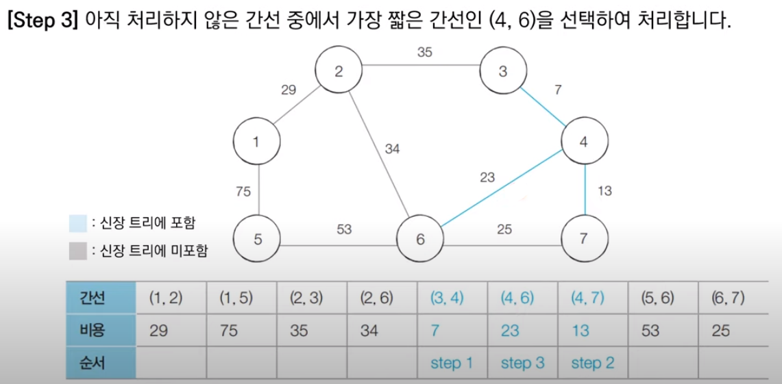 다음 최소 비용에 해당하는 4, 6번 노드를 잇는 간선도 두 노드가 다른 집합에 속해 있으므로 Union 함수를 호출해 최소 신장 트리에 포함시킨다.