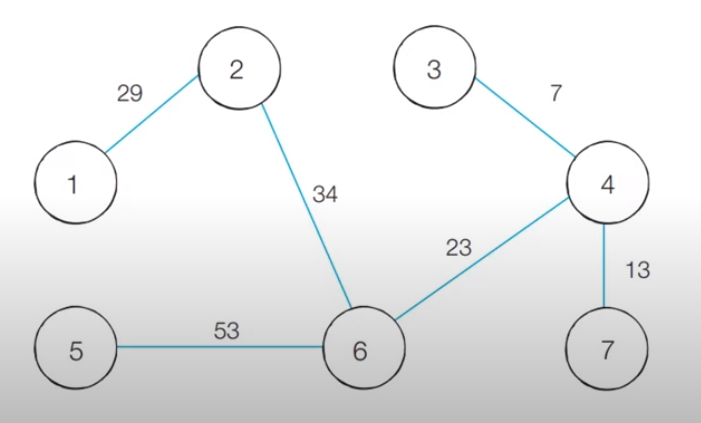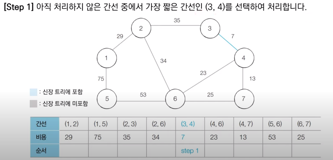 처음으로 가장 최소인 비용을 가지는 3, 4번 노드를 잇는 간선을 확인한다. 두 노드는 다른 집합에 속해 있어 사이클 생성이 불가능하므로 Union 함수를 호출해 같은 집합으로 만들어 최소 신장 트리에 포함한다.