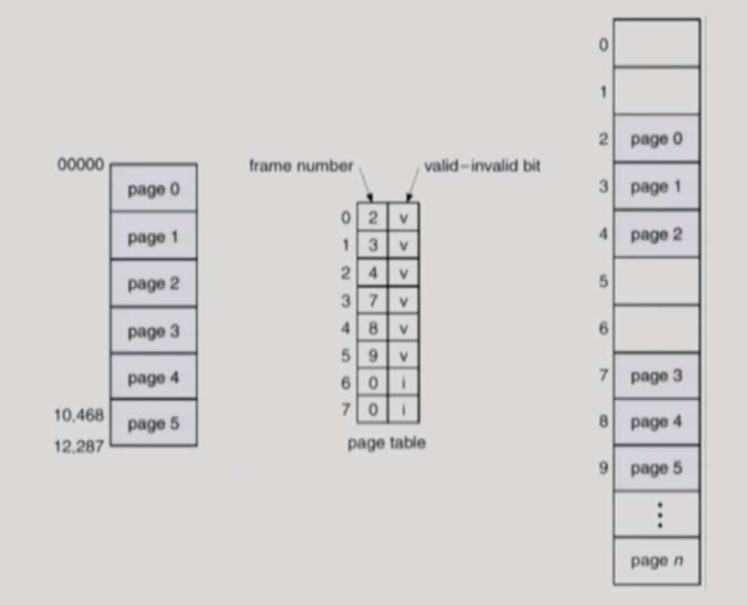 페이지 테이블에는 해당 페이지가 실제로 사용되느냐 안되느냐를 표현하는 valid-invaild bit이 존재한다. Valid는 해당 주소의 frame에 프로세스를 구성하는 유효한 내용이 있어 접근을 허용함을 뜻하고, invalid는 해당 주소의 frame에 유효한 내용이 없어 접근을 허용하지 않음을 뜻한다. Invalid에서 해당 주소 frame에 유효한 내용이 없다는 것은 프로세스가 해당 주소 부분을 사용하지 않는 경우 혹은 해당 페이지가 메모리에 올라와 있지 않고 swap area에 있는 경우를 말한다.