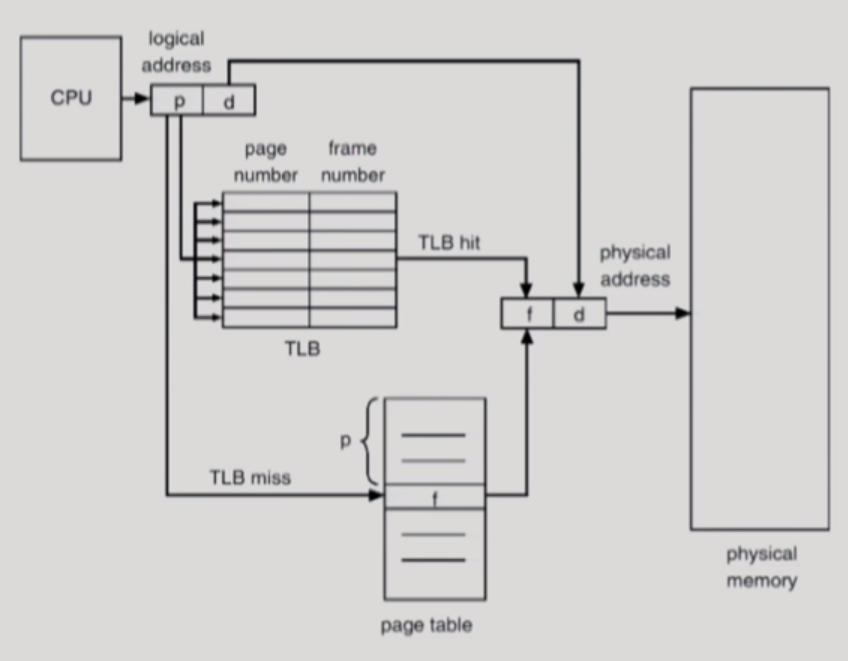 유의할 점은 page table의 경우 page number를 index로 바로 frame number를 알 수 있는 반면, TLB는 page number와 frame number가 쌍으로 이루어져 있어서 frame number를 알고 싶다면 전체 TLB의 원소를 모두 다 검색해봐야 검색 유무를 판단할 수 있다는 것이다. 따라서, 이 검색을 원활히 진행시키기 위해 associative register들로 parallel search가 가능하도록 해 단번에 frame number를 알 수 있도록 만든다.