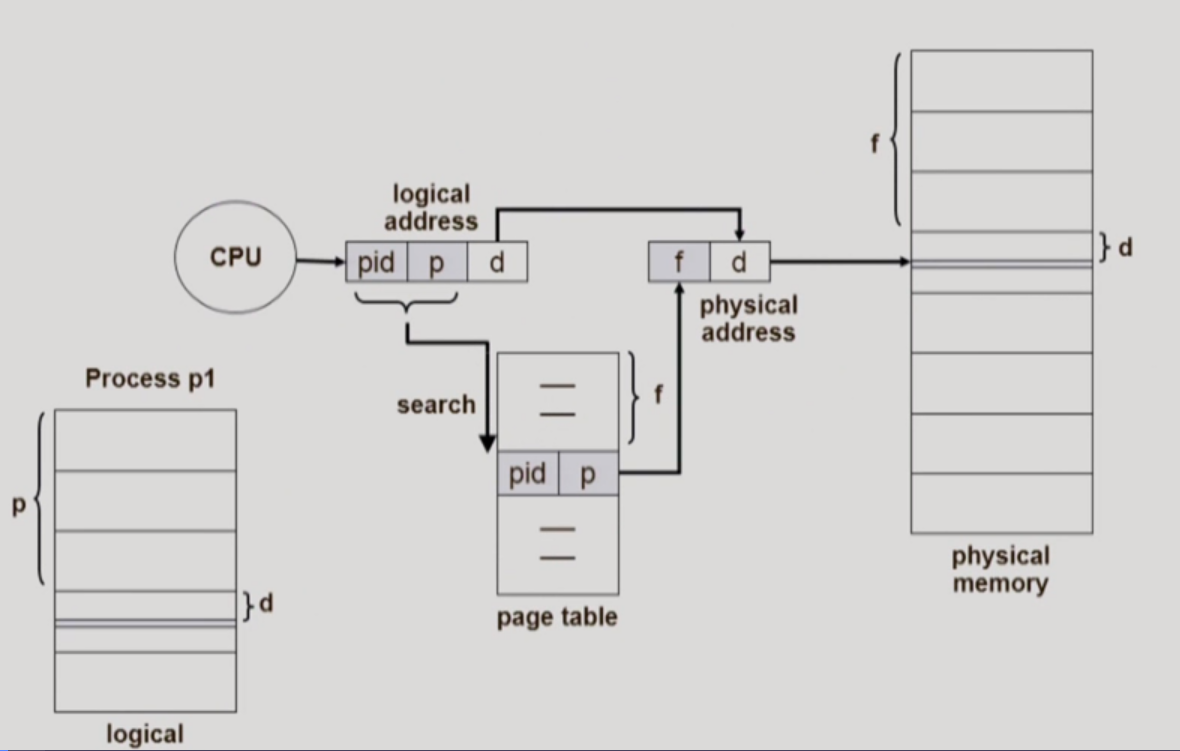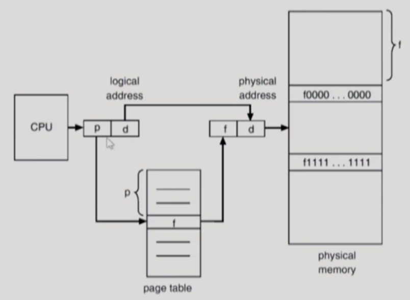 위 그림으로 조금 더 자세히 살펴보자. CPU가 어떤 논리적 주소를 주면, 논리적 주소의 앞 부분 p는 페이지 번호가 되고, 뒷 부분 d는 페이지 번호의 주소에서 얼마나 떨어져 있는지 알려주는 offset이 된다. 따라서, p를 page table의 entry(=index)로 사용하면, 페이지 번호에 해당하는 frame 번호 f를 구할 수 있고 논리적 주소를 물리적 주소로 변환할 수 있게 된다.
