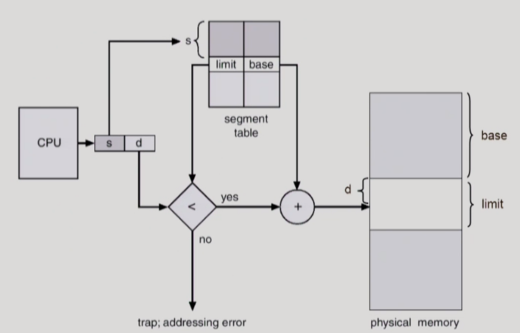 위의 그림에서 CPU가 논리적 주소를 주게 되면, segment table에서 논리적 주소의 segment 번호 s에 해당하는 entry를 찾게 된다. 그리고 entry에서의 base 값과 논리적 주소의 offset d를 이용해 물리적 주소에 접근한다. 또한, 물리적 메모리에 접근하기 전에 해당 entry에서 limit 값을 확인하여, 논리적 주소의 offset 값이 프로그램의 주소 범위를 벗어나지 않았는지 파악한다. Paging 기법과 달리 각각의 Segement는 길이가 다르기 때문에, entry에 존재하는 limit 값을 통해 segment의 길이를 결정짓는 것이 중요하고, 이를 활용해 프로그램의 범위를 벗어나는 악의적인 접근에 대해 trap을 건다.