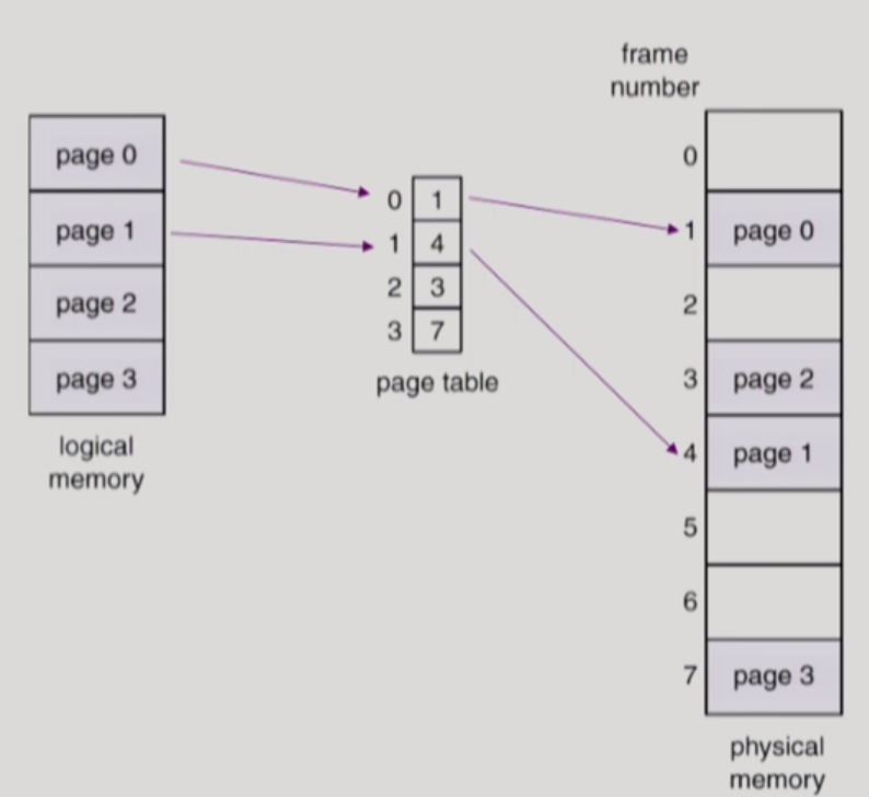 Paging 기법을 사용하기 위해서 physical memory를 동일한 크기의 frame으로, logical memory를 동일한 크기의 page로(frame과 같은 크기) 나눠야 한다. 그리고 기존과 달리 page table을 사용해서 logical address를 physical address로 주소 변환한다. 이 기법을 사용하면 가장 마지막 페이지로 인해 발생하는 내부 조각은 존재할 수 있지만, 마지막 page를 제외한 모든 page와 frame의 크기가 동일하기 때문에 외부 조각은 발생하지 않는다.