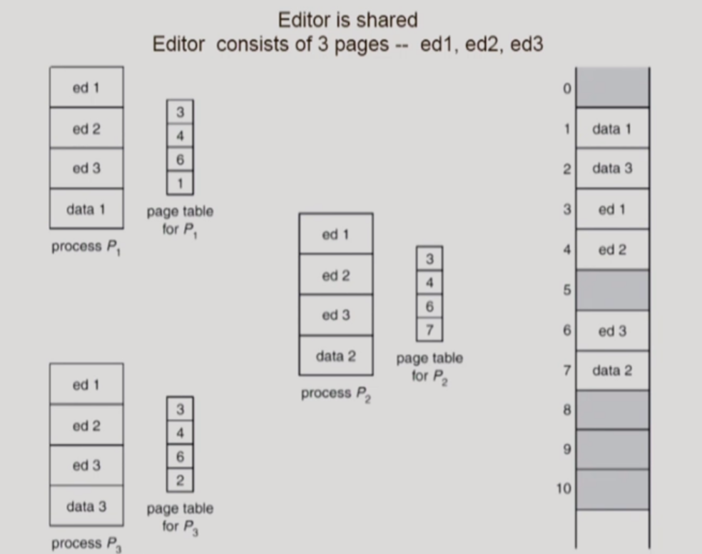 Shared page는 shared code가 page로 나뉠 때 사용되는 용어이다. Shared Code(=Re-entrant Code =Pure code)는 프로세스마다 동일한 프로그램을 실행함으로 인해 같은 코드가 쓰이는 경우에 read-only 상태로 공유하고 메모리에 올리는 하나의 코드를 말한다. 예를 들어, Text editor나 compiler, window systems 같은 프로그램들은 굳이 코드를 여러번 중복할 필요가 없기 때문에, shared code로 공유한다. 이러한 shared code는 모든 프로세스의 논리적 주소 공간에서 동일한 위치에 있어야 하며, 각 프로세스의 독립적인 private code와 data는 프로세스의 논리적 주소 공간 어디에 위치해도 상관없다.