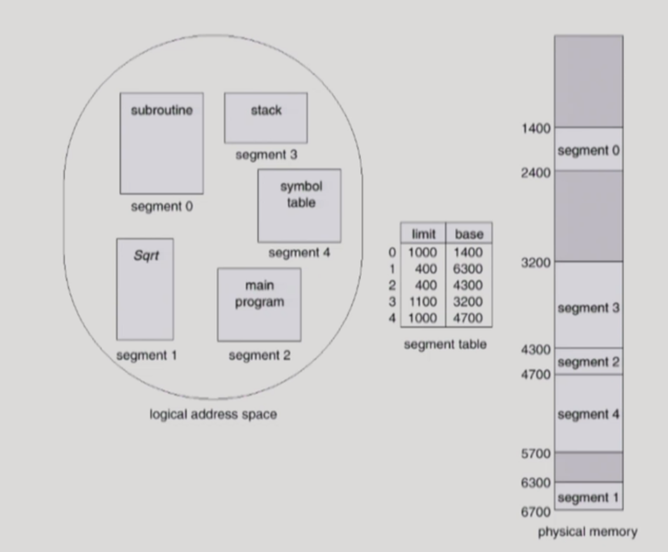 Segmentation에서 논리적 주소는 segment-number와 offset으로 구성된다. 또한 Paging 기법과 비슷하지만 다르게 사용되는 segment table이 존재하며, 테이블 내 각각의 entry에는 segment의 물리적 주소 시작점을 담는 base와 segment의 길이를 담는 limit이 존재한다. 또한, 물리적 메모리에서 segment table의 위치를 담는 Segment-table base register(STBR)와 프로그램이 사용하는 segment의 수를 기록하는 Segment-table length register(STLR)가 존재한다.