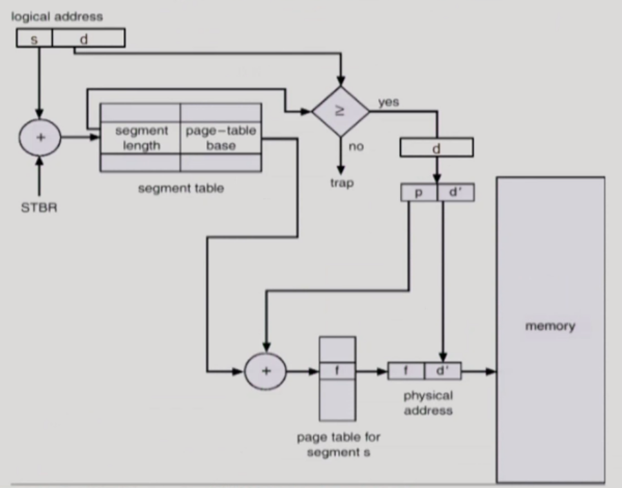 Paged Segmentation의 과정을 살펴보자. 위 그림에서 CPU가 논리적 주소를 주면 segment 번호 s를 사용해 segment table의 해당 entry에 접근한다. 그리고 offset d가 해당 entry의 limit 값을 넘어가지 않는다면, d에 존재하는 페이지 번호 p를 사용해 해당 segment에 mapping된 page table의 entry에 접근한다.(offset d가 limit 값을 넘어간다면, trap을 건다.) 그 후, entry에 해당하는 프레임 번호 f와 d에 존재하는 offset d'을 더해 물리적 주소로 변환을 완료한다.