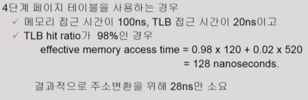 예를 들어, 4단계 페이지 테이블을 이용하는 경우만 해도 위와 같이 메모리 접근 시간이 크게 소요되지 않음을 알 수 있다.