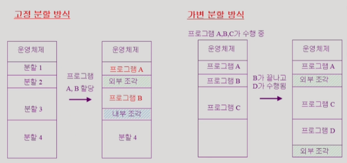 각각의 프로세스가 메모리의 연속적인 공간에 적재되도록 하는 것이다. 연속 할당 방식은 두 가지가 존재한다.