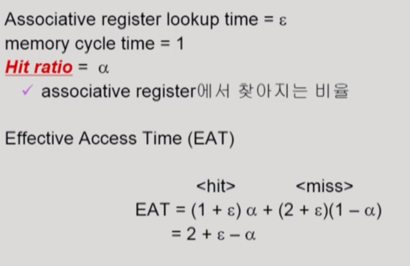 앞서 살펴본 것을 토대로 메모리 접근 시간을 파악해보면 위와 같다. 결론적으로 1보다 작은 값 입실론과 1에 아주 가까운 알파 값으로 인해 EAT(Effective Access Time)는 2보다 작아지게 되어, 적어도 메모리에 두 번 접근하는 것보다 나은 방법이 된다는 것이 증명된다.