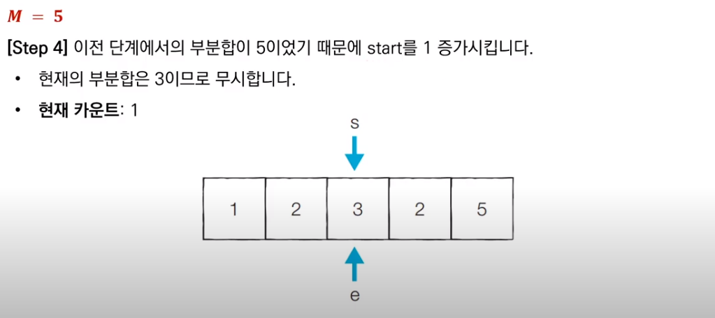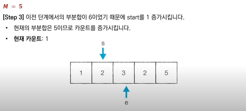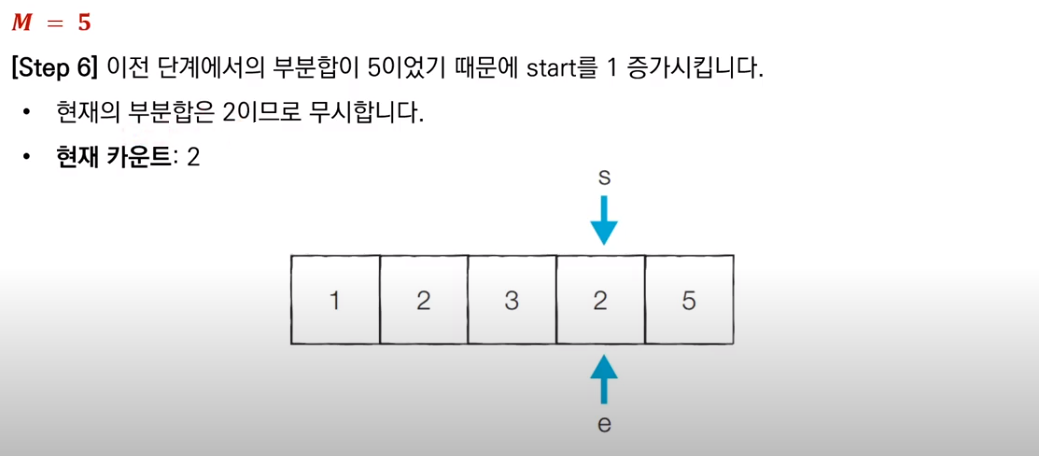 이전 부분합이 M보다 컸으므로, start를 1 증가시키고 새로운 부분합을 구한다. 현재 부분합은 5이므로 카운트를 센다.