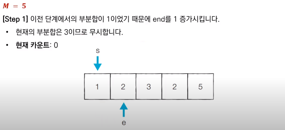 이전 부분합이 M보다 작았기 때문에, end를 1 증가시키고 새로운 부분합을 구한다. 구해진 부분합은 3이므로 무시한다.