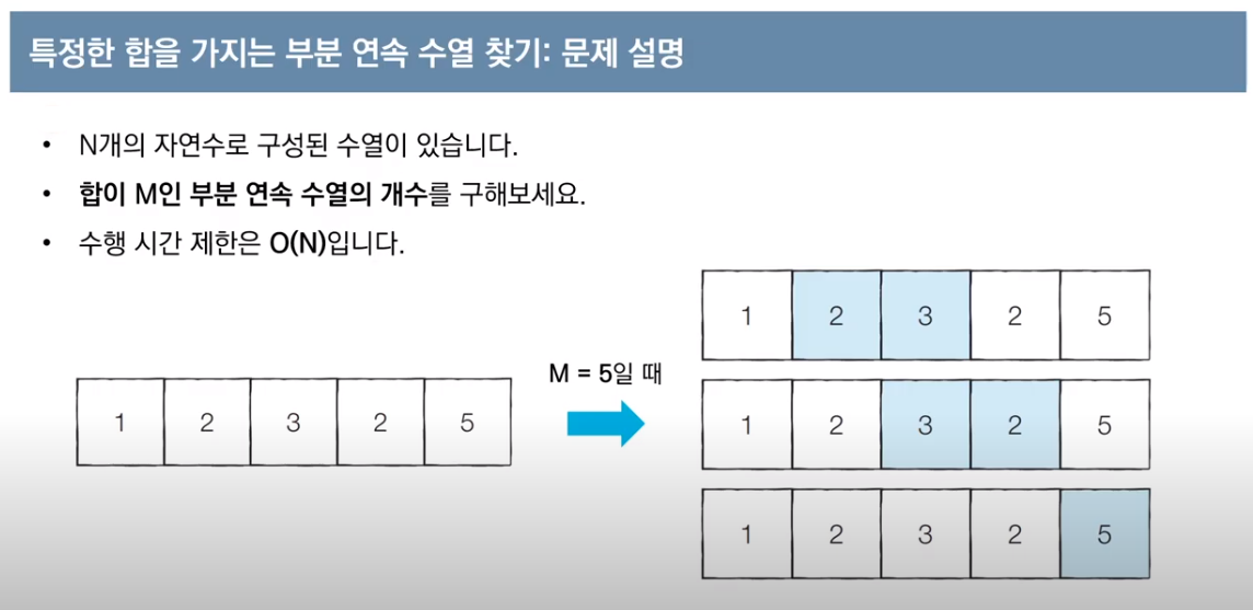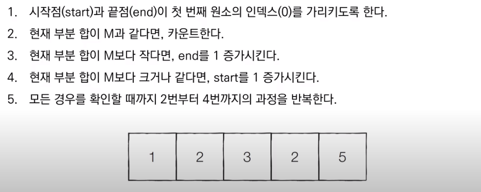 n = 5 # 데이터의 개수 N m = 5 # 찾고자 하는 부분합 M data = [1, 2, 3, 2, 5] # 전체 수열 count = 0 interval_sum = 0 end = 0 # start를 차례대로 증가시키며 반복 for start in range(n): # end를 가능한 만큼 이동시키기 while interval_sum < m and end < n: interval_sum += data[end] end += 1 # 부분합이 m일 때 카운트 증가 if interval_sum == m: count += 1 interval_sum -= data[start] print(count)본 포스팅은 '안경잡이 개발자' 나동빈 님의 저서