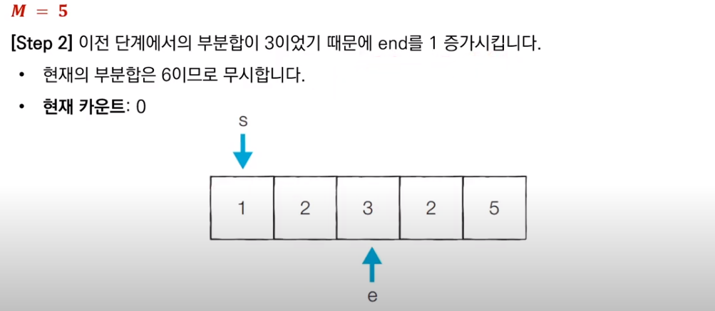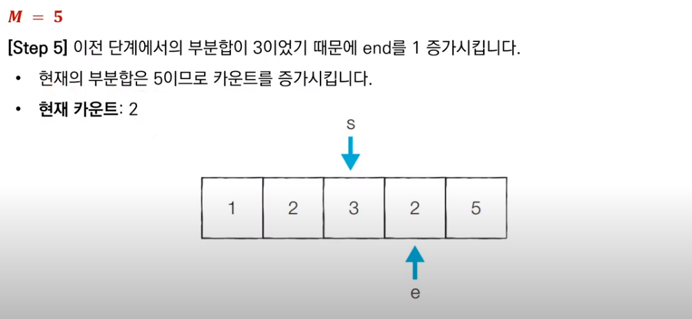 이전 부분합이 M보다 작았으므로, end를 1 증가시키고 새로운 부분합을 구한다. 현재 부분합은 5이므로 카운트를 센다.