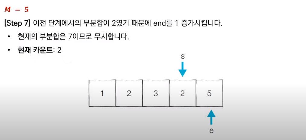 이전 부분합이 M보다 작았으므로, end를 1 증가시키고 새로운 부분합을 구한다. 현재 부분합은 7이므로 무시한다.