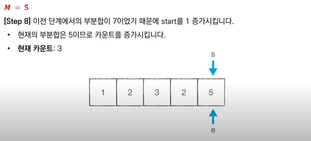 이전 부분합이 M보다 컸으므로, start를 1 증가시키고 새로운 부분합을 구한다. 현재 부분합은 5이므로 카운트를 센다. 그리고 알고리즘은 마무리된다.