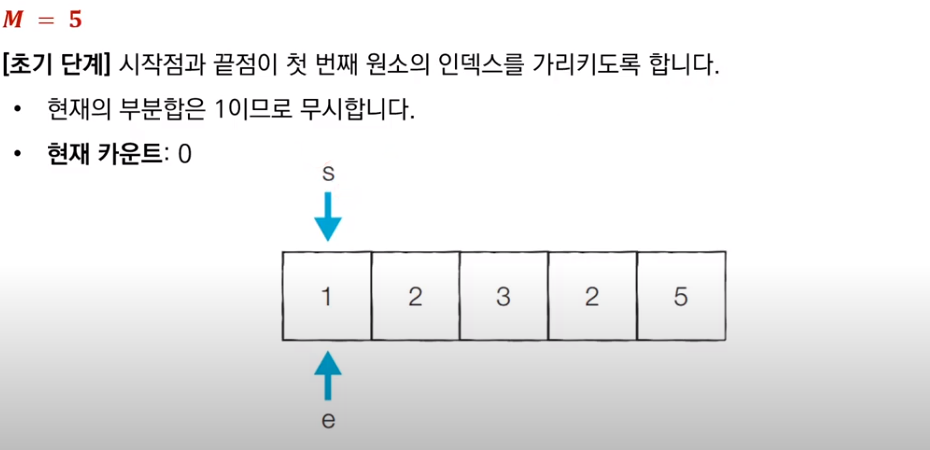 가장 먼저 시작점과 끝점이 첫 번째 원소의 인덱스를 가리키도록 초기화한다. 또한, 문제에서 원하는 부분합 M은 5이다. 현재 부분합은 1이고 M보다 작으므로 무시한다.