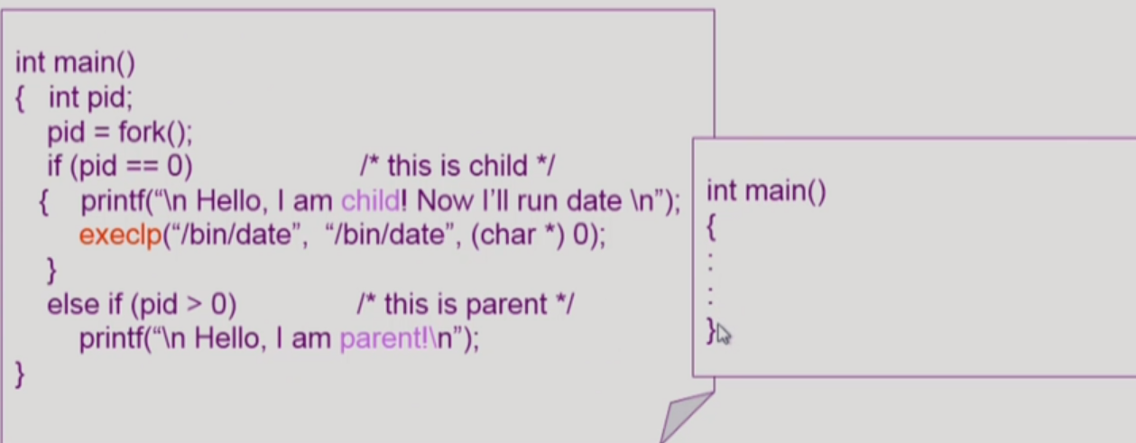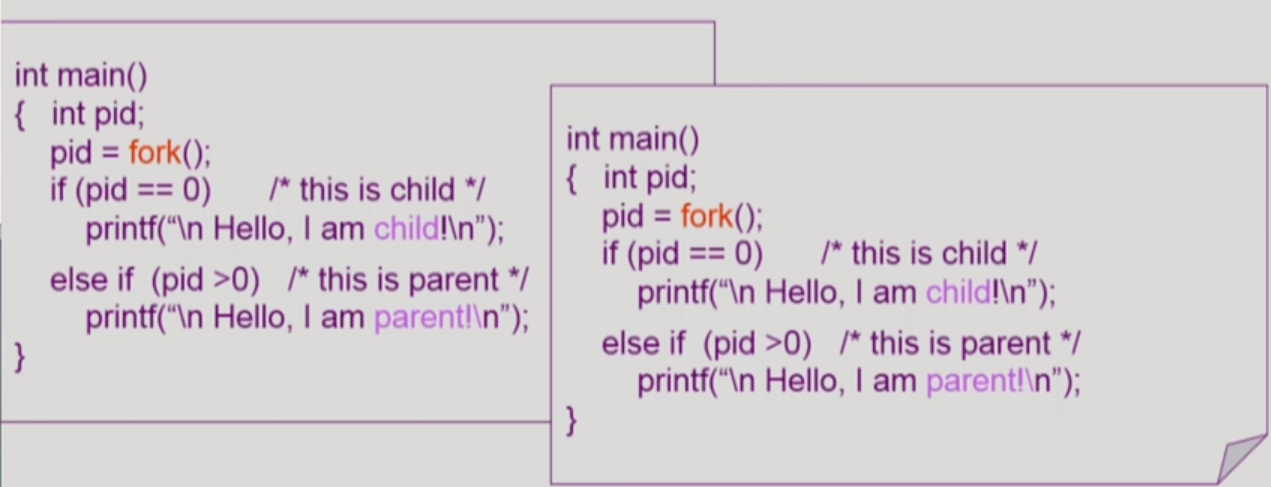 <fork를 사용해 사용자 프로그램이 프로세스를 만드는 코드> 위 그림의 두 코드는 부모 프로세스(좌), 자녀 프로세스(우)이다. 처음 부모 프로세스가 코드를 수행하다가 fork 시스템 콜을 만나면, 부모 프로세스를 똑같이 복사해 자녀 프로세스를 만들고 이후 명령을 계속 실행한다. 자녀 프로세스는 부모 프로세스의 Program Counter를 그대로 복제했기 때문에, 부모 프로세스와 마찬가지로 fork의 바로 밑 코드부터 실행한다.