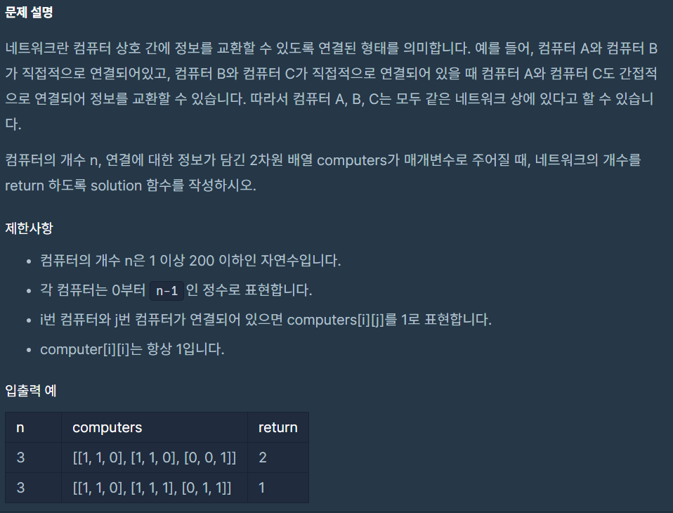 방문 정보 테이블을 하나씩 확인하면서, 아직 방문하지 않은 노드가 있다면 DFS를 수행하고 네트워크 개수를 하나 센다.